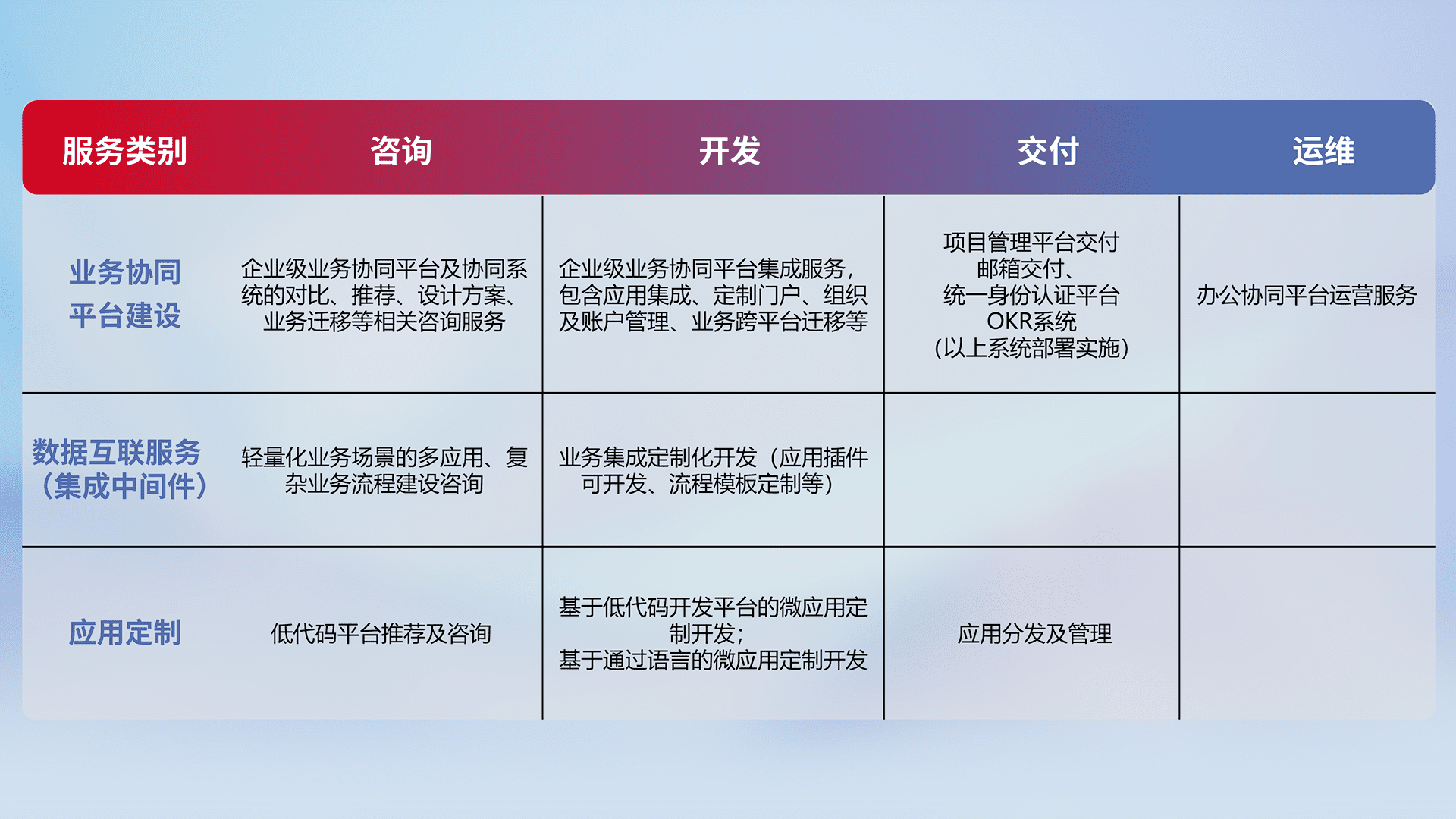 针对钉钉、、企微、、、IDaas等平台级产品提供产品的规划、、、、方案、、交付、、、定制化开发等服务,,,,实现如统一协同办公、、、、智能客户服务、、混合会议管理、、、智能数据查询、、、等业务场景,,,,实现数字化转型。。。。